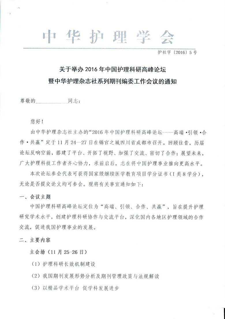 2016年中国护理科研高峰论坛暨中华护理杂志社系列期刊编委工作会议