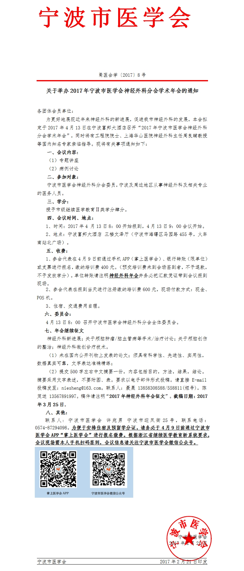 2017年宁波市医学会神经外科分会学术年会