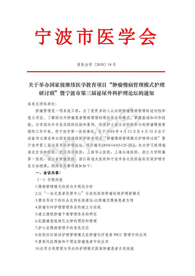 宁波市国家级继续医学教育项目“肿瘤慢病管理模式护理研讨班”暨宁波市第三届泌尿外科护理论坛