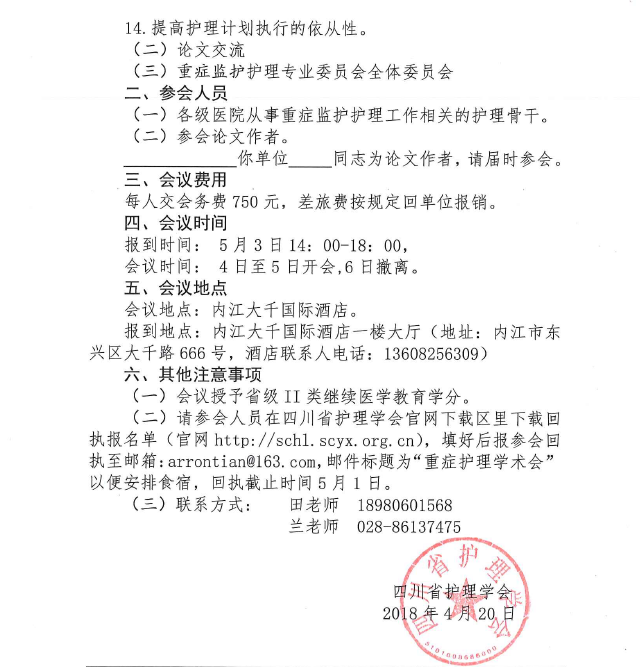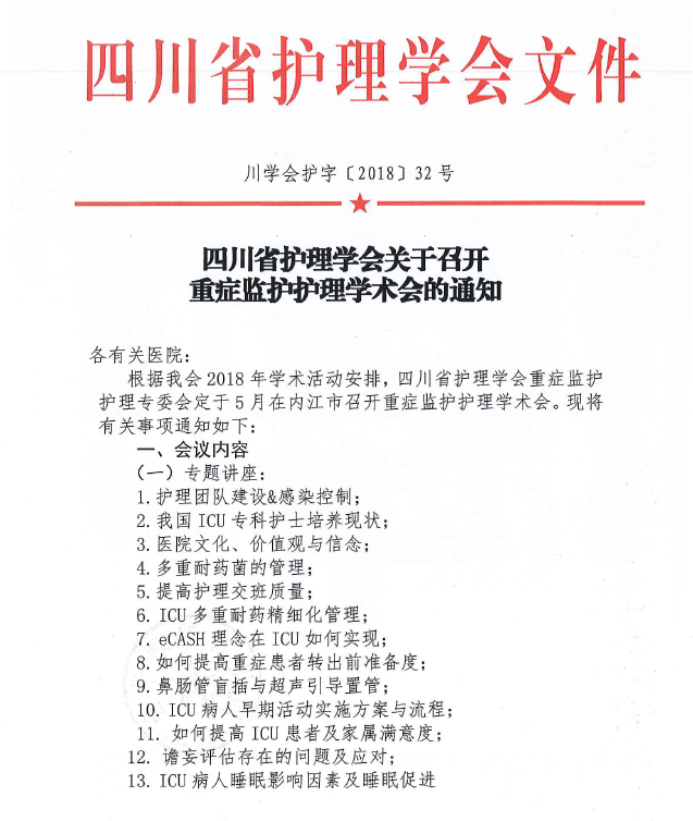 四川省护理学会关于召开2018重症监护护理学术会