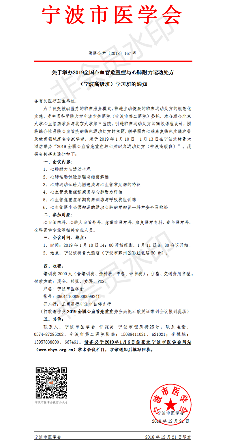 2019全国心血管危重症与心肺耐力运动处方(宁波高级班)学习班