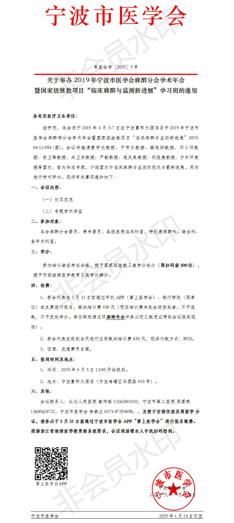 2019 年宁波市医学会麻醉分会学术年会暨国家级继教项目“临床麻醉与监测新进展”学习班