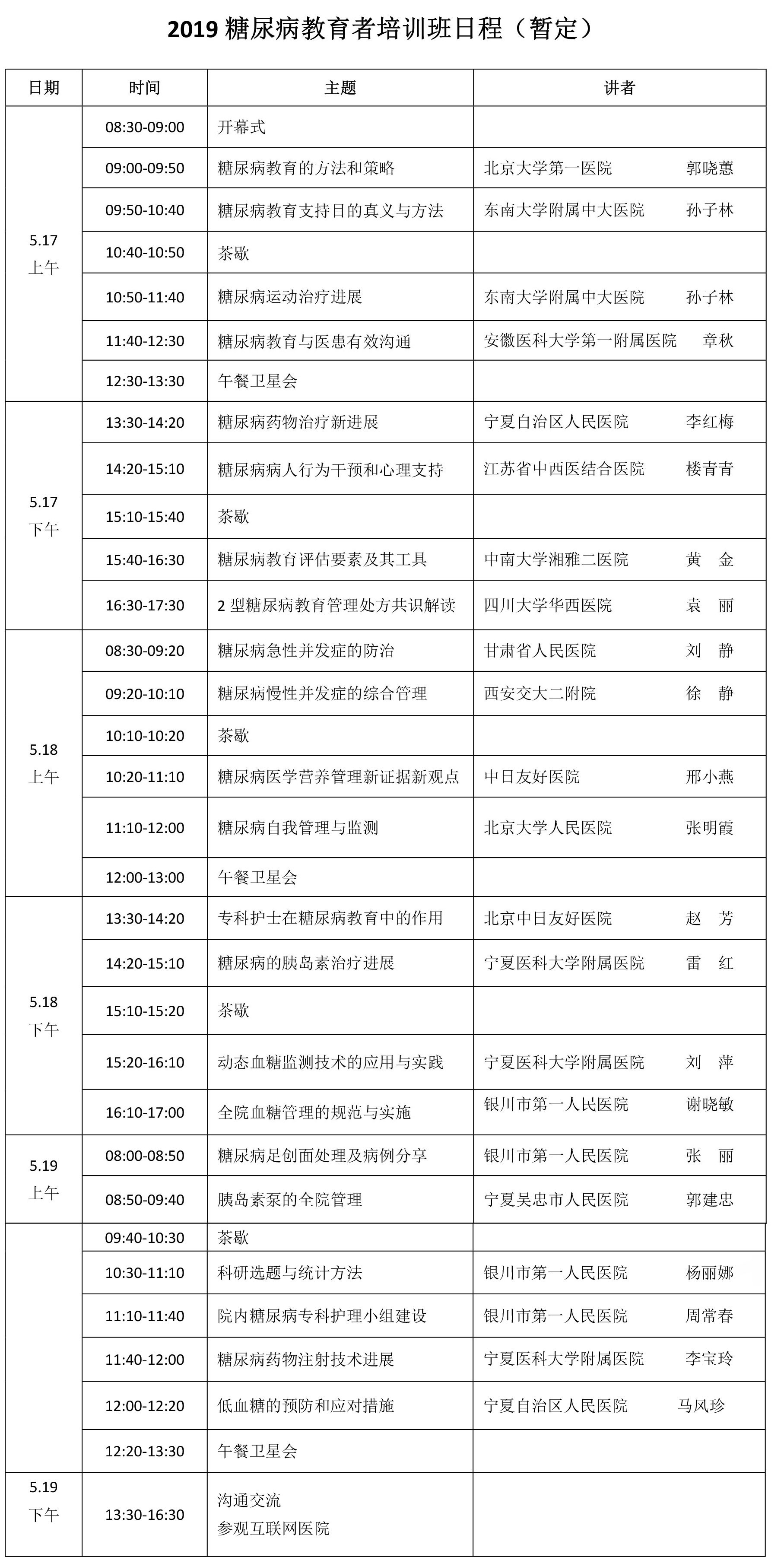 为了进一步建立系统专业的糖尿病教育者培训管理体系,配合全国各级医院糖尿病综合防治工作的开展,为各地培养糖尿病教育管理工作的骨干力量,提高全国糖尿病教育管理水平,特别是促进西部地区的相关工作开展,中华医学会糖尿病学分会定于2019年5月16-19日在宁夏银川举办2019年“糖尿病教育者培训班”。