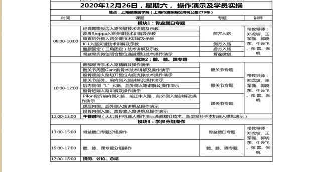 由上海市医学会骨科学分会创伤学组和骨科在线主办,同济大学附属第十人民医院(暨上海市第十人民医院)承办,中华医学会骨科学分会外固定与肢体重建学组、国家骨科与运动康复临床医学中心、301 环骨盆微创救治联盟、上海健康医学院、上海市解剖学会协办的“第三届骨盆髋臼及关节周围骨折微创治疗学习班”,将于 2020 年12 月 24-27 日在上海市锦荣国际大酒店和上海健康医学院解剖学教研室举行。届时诚邀多位具有丰富临床经验的国内知名骨科专家,传授创伤骨科微创手术理念和相关手术技巧,手把手、面对面指导学员进行解剖操作演练。