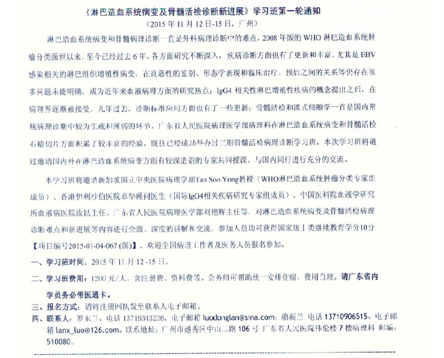 淋巴造血系统病变和骨髓病理诊断一直是外科病理诊断中的难点,2008年版的WHO淋巴造血系统肿瘤分类面世以来,至今已经过去6年,各方面研究不断深入, 疾病诊断方面也有了更新和丰富。尤其是EBV感染相关的淋巴组织增殖性病变,在良恶性的鉴别、形态学表现和临床治疗、预后之间的关系等仍存在很多问题未能明确,成为近年来血液病理方面的研究热点;IgG4相关性淋巴增殖性疾病的概念提出之后,在病理界逐渐被接受,几年过去,诊断标准应用方面也有了一些更新;骨髓活检和流式细胞学一直是国内常规病理诊断中较为生疏和薄弱的环节。广东省人民医院病理医学部病理科在淋巴造血系统病变和骨髓活检石蜡切片方面积累了较丰富的经验,既往已经成功举办过三期骨髓活检病理诊断学习班,本次学习班将通过邀请国内外在淋巴造血系统病变方面有较深造诣的专家共同授课,与国内同行进行充分的交流。