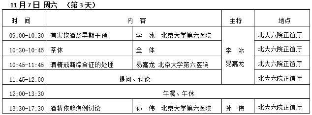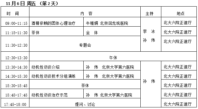 北京大学第六医院举办的2015年“酒精依赖研究与诊断治疗新进展全国培训班”将于2015年11月5日-7日在北京举行。