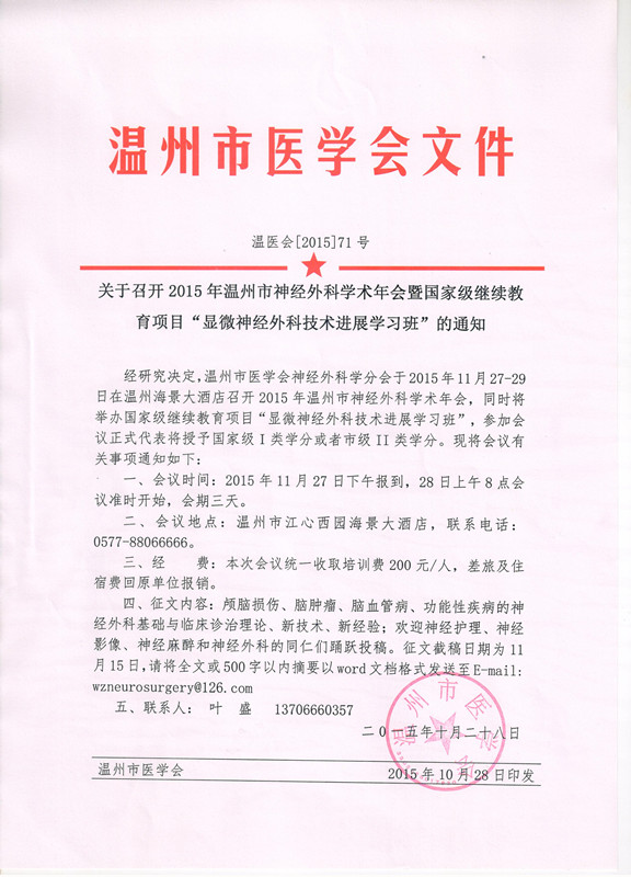 2015年温州市神经外科学术年会暨国家级继续教育项目“显微神经外科技术进展学习班”