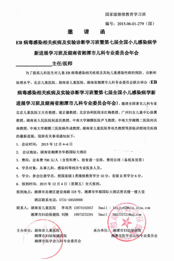 EB病毒感染相关疾病及实验诊断学习班暨第七届小儿感染病学新进展学习班及湖南省湘潭市儿科专业委员会年会