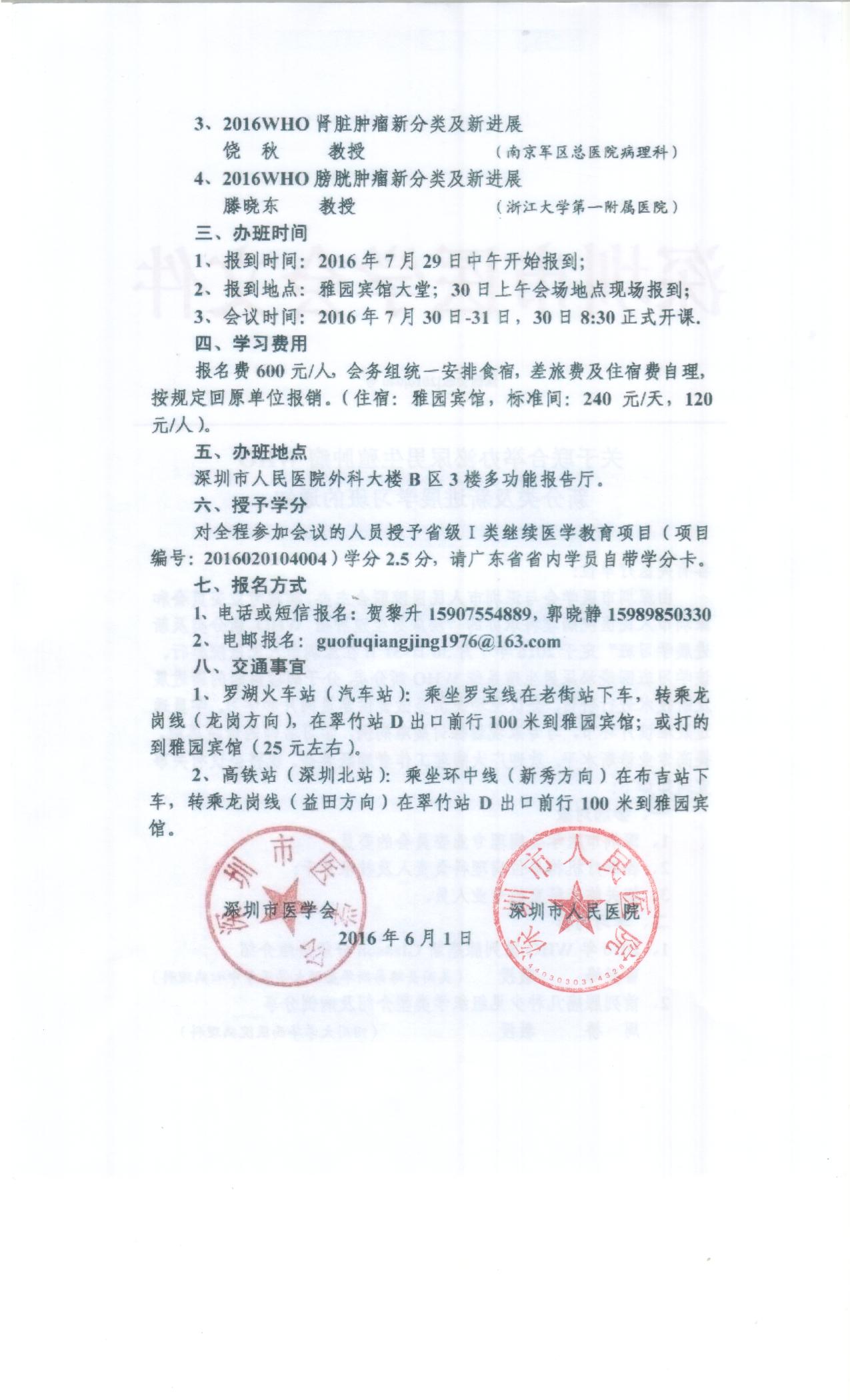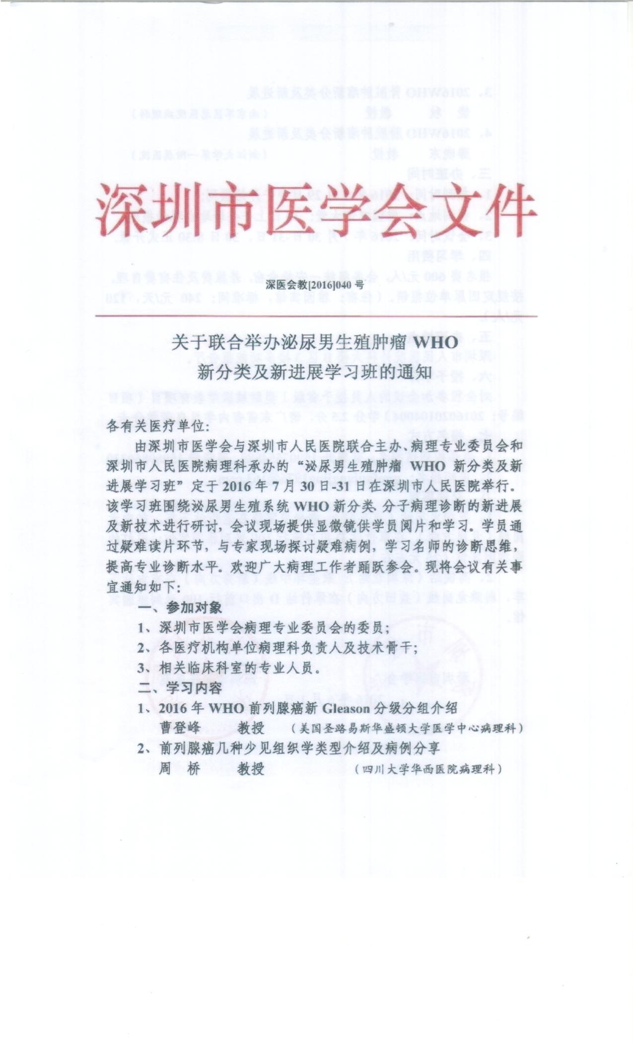 由深圳市医学会与深圳市人民医院联合主办、病理专业委员会和深圳市人民医院病理科承办的“泌尿男生殖肿瘤WHO新分类及新进展学习班”定于2016年7月30日-31日在深圳市人民医院举行。该学习班围绕泌尿男生殖系统WHO新分类、分子病理诊断的新进展及新技术进行研讨,会议现场提供显微镜供学员阅片和学习。学员通过疑难读片环节,与专家现场探讨疑难病例,学习名师的诊断思维,提高专业诊断水平。欢迎广大病理工作者踊跃参加。