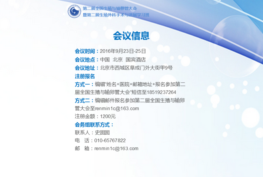 由《中国妇产科临床杂志》社、全国卫生产业企业管理协会妇幼健康产业分会、北京医师协会、北京大学人民医院生殖医学中心联合主办的《第二届全国生殖与输卵管大会暨第二届生殖外科手术及进展研讨会》将于2016年09月23日-25日在北京盛大呈献。