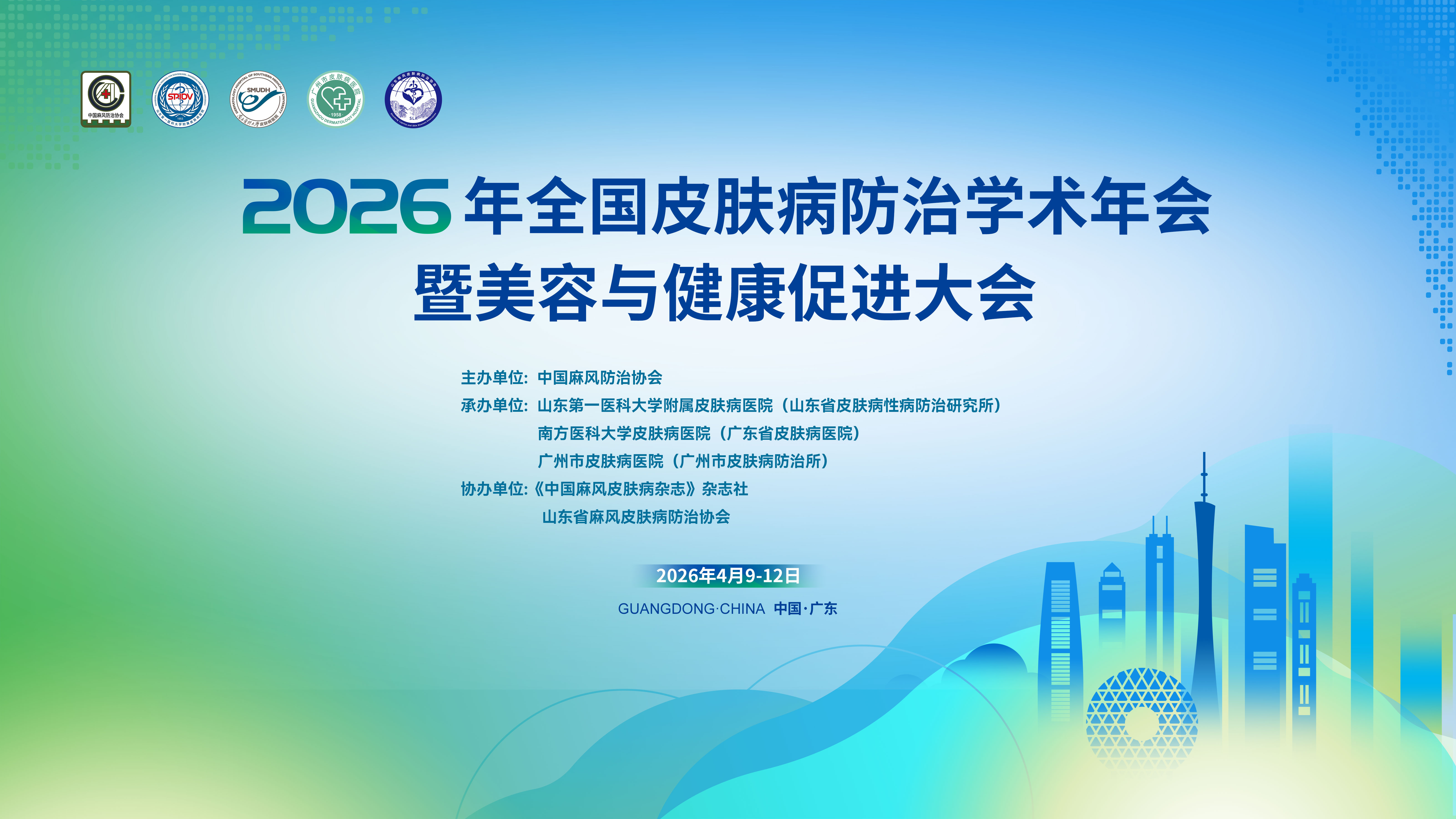 为加强全国皮肤病防治领域在临床诊疗、科学研究、疾病防治、皮肤保健和学科建设等方面的交流,经中国麻风防治协会党委会讨论,定于2026年4月9日至12日在广东省广州市举办2026年全国皮肤病防治学术年会暨美容与健康促进大会。本次年会由中国麻风防治协会主办,山东第一医科大学附属皮肤病医院(山东省皮肤病性病防治研究所)、南方医科大学皮肤病医院(广东省皮肤病医院)联合承办,《中国麻风皮肤病杂志》杂志社和山东省麻风皮肤病防治协会共同协办。