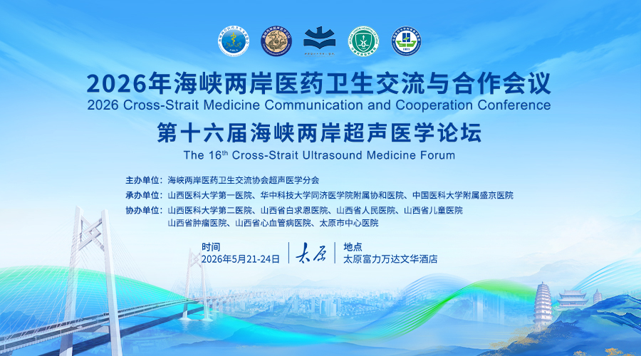 由海峡两岸医药卫生交流协会超声医学分会主办,山西医科大学第一医院、华中科技大学同济医学院附属协和医院、中国医科大学附属盛京医院共同承办的“2026年海峡两岸医药卫生交流与合作会议第十六届海峡两岸超声医学论坛”将于2026年5月21—24日在山西省太原市举行。