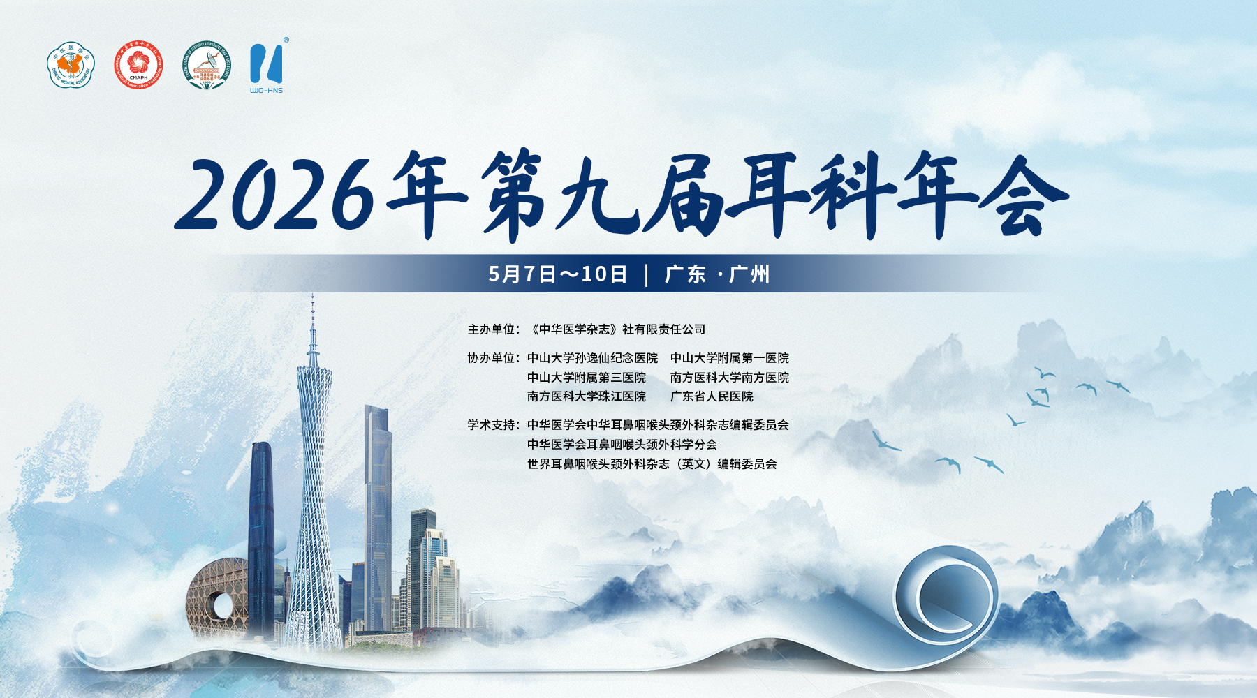 由《中华医学杂志》社有限责任公司(中华医学会杂志社)主办,中山大学孙逸仙纪念医院、中山大学附属第一医院、中山大学附属第三医院、南方医科大学南方医院、南方医科大学珠江医院、广东省人民医院共同协办,中华医学会中华耳鼻咽喉头颈外科杂志编辑委员会、中华医学会耳鼻咽喉头颈外科学分会、世界耳鼻咽喉头颈外科杂志(英文)编辑委员会学术支持的2026年第九届耳科年会,定于2026年5月7—10日在广东省广州市召开。