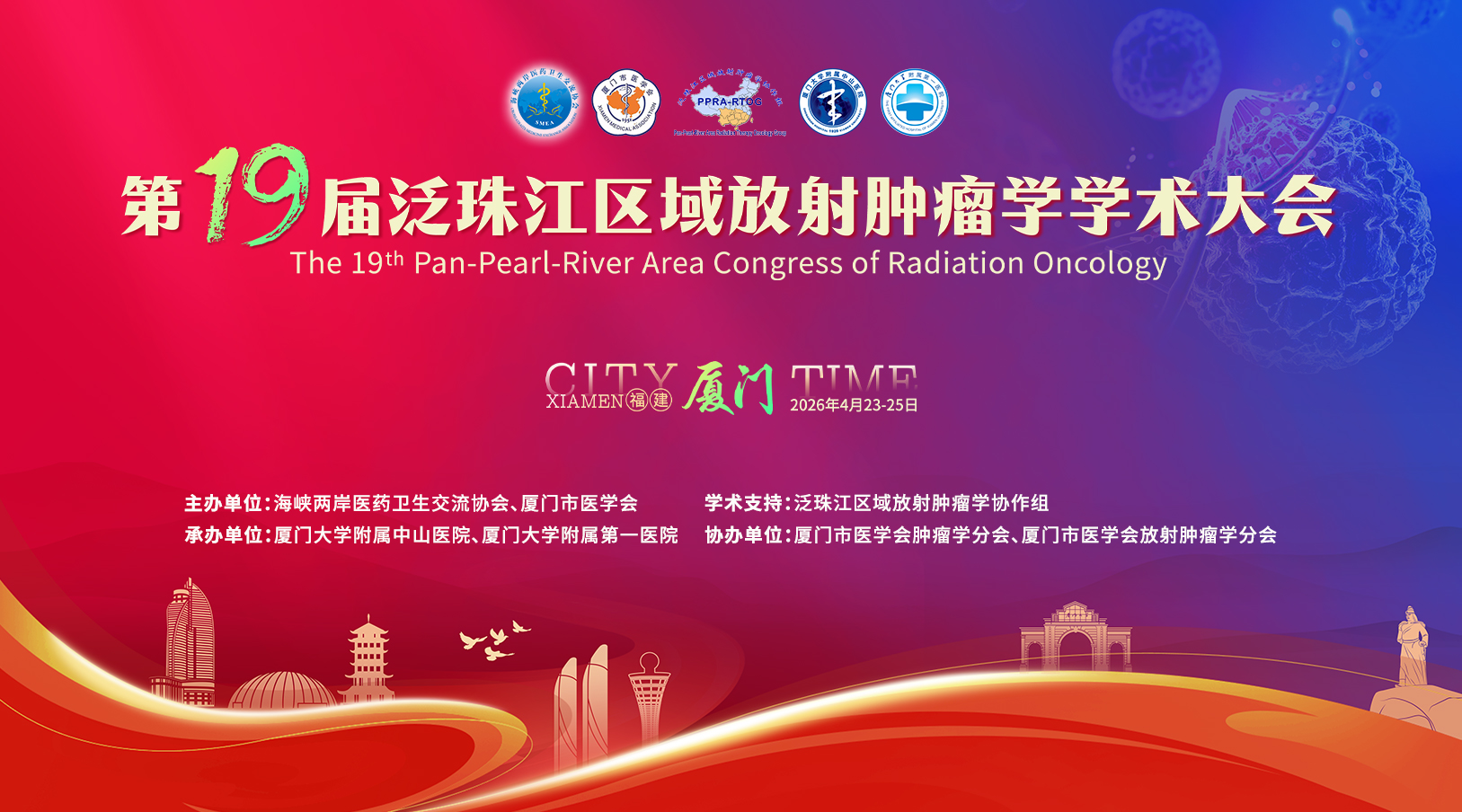 由海峡两岸医药卫生交流协会、厦门市医学会主办,泛珠江区域放射肿瘤学协作组作为学术支持,厦门大学附属中山医院、厦门大学附属第一医院承办,厦门市医学会肿瘤学分会、厦门市医学会放射肿瘤学分会协办的“第19届泛珠江区域放射肿瘤学学术大会”将于2026年04月23日-25日在福建省厦门市召开。
