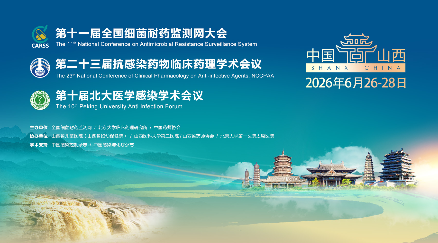 同心致远赴新约,聚力攻坚护健康!由全国细菌耐药监测网、北京大学临床药理研究所、中国药师协会联合主办的“第十一届全国细菌耐药监测网大会”、“第二十三届抗感染药物临床药理学术会议”和“第十届北大医学感染学术会议”,拟定于2026年6月26-28日在山西省太原市举行。