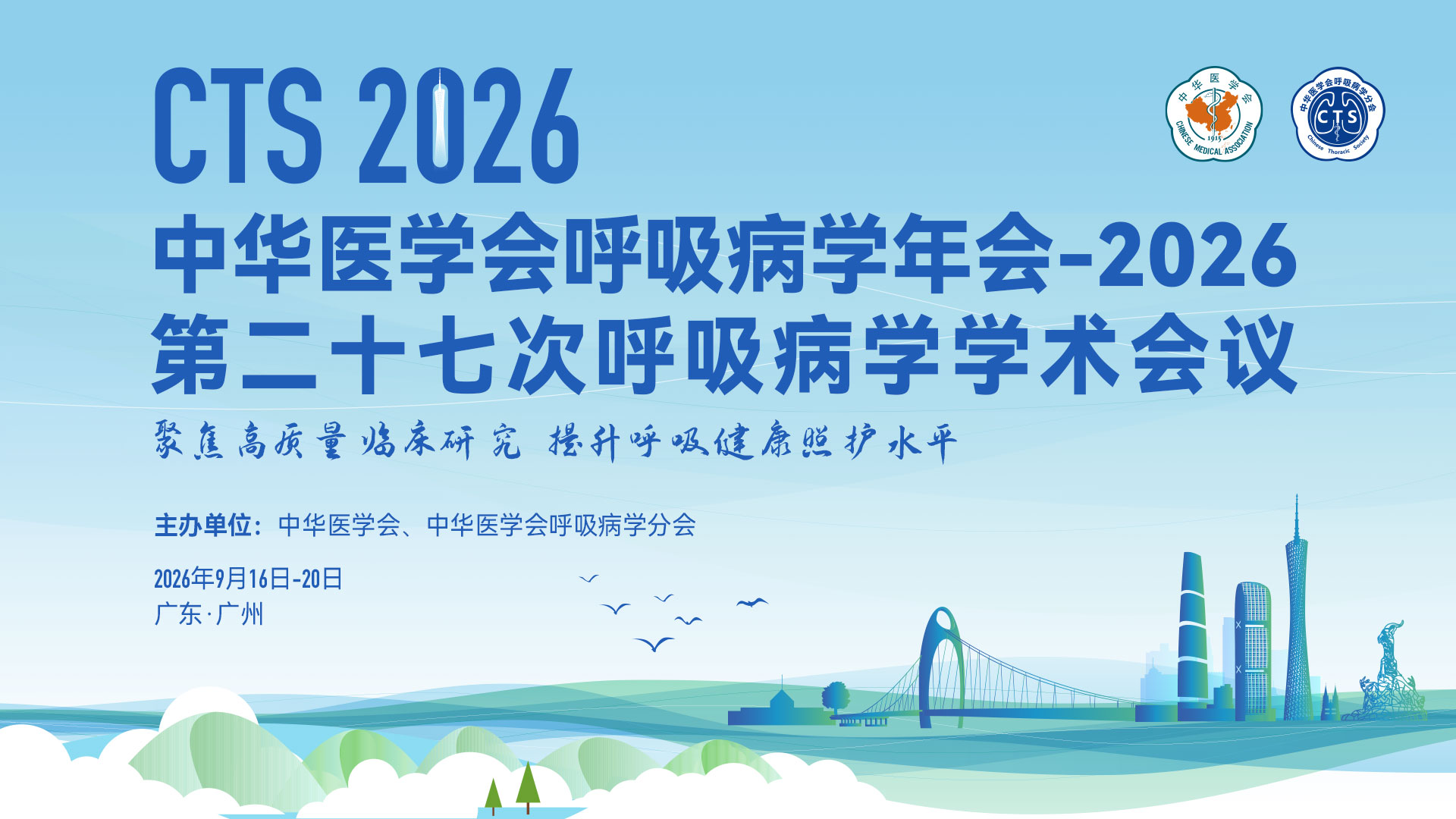 由中华医学会和中华医学会呼吸病学分会主办的中华医学会呼吸病学年会-2026(第二十七次呼吸病学学术会议)定于2026年9月16日-20日在广东省广州市召开。