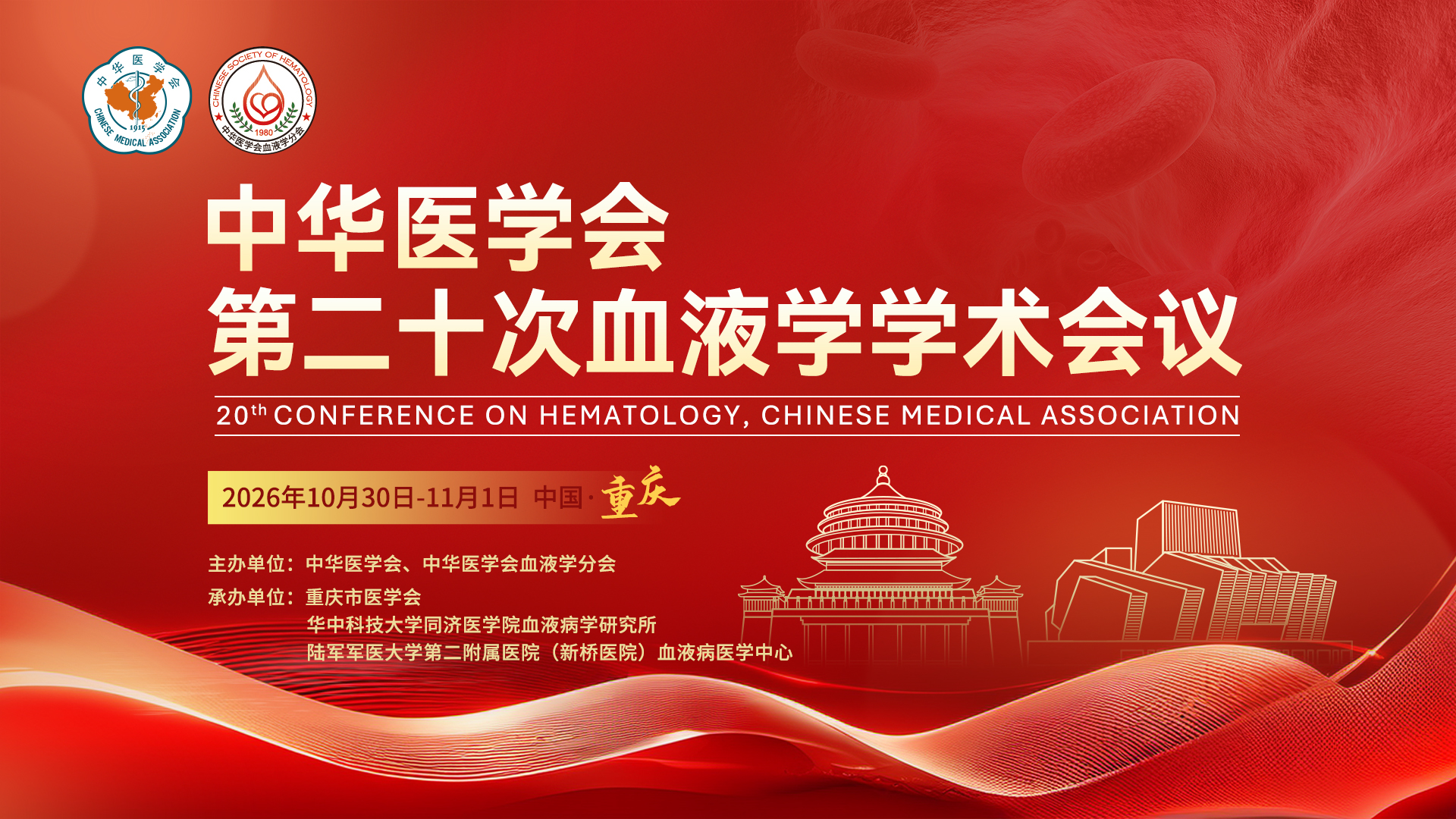 由中华医学会、中华医学会血液学分会共同主办,重庆市医学会、华中科技大学同济医学院血液病学研究所、陆军军医大学第二附属医院(新桥医院)血液病医学中心承办的中华医学会第二十次血液学学术会议,本次会议将于2026年10月30日-11月1日在重庆市悦来国际会议中心举办。大会组委会诚挚邀请各位参加。