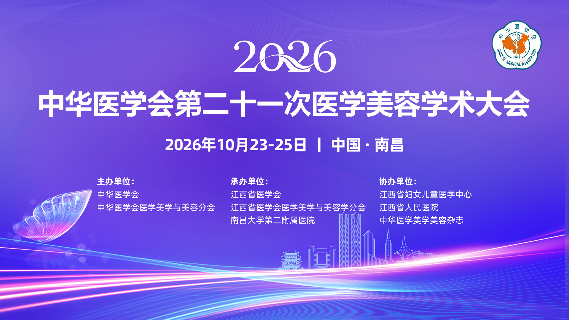 由中华医学会、中华医学会医学美学与美容学分会主办,江西省医学会、江西省医学会医学美学与美容学分会、南昌大学第二附属医院承办,江西省妇女儿童医学中心、江西省人民医院协办的2026中华医学会第二十一次医学美容学术会议将于2026年10月23-25日在江西省南昌市举行。