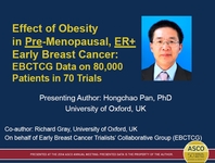 2014年ASCO年会上的一项口头报告的PPT,该项研究纳入70个临床试验包含80000名早期乳腺癌妇女,研究发现只有在20000名绝经前ER+阳性患者中,肥胖与乳腺癌相关死亡增加34%具有相关性。肥胖对绝经后ER阳性,或ER阴性女性几乎没有影响。